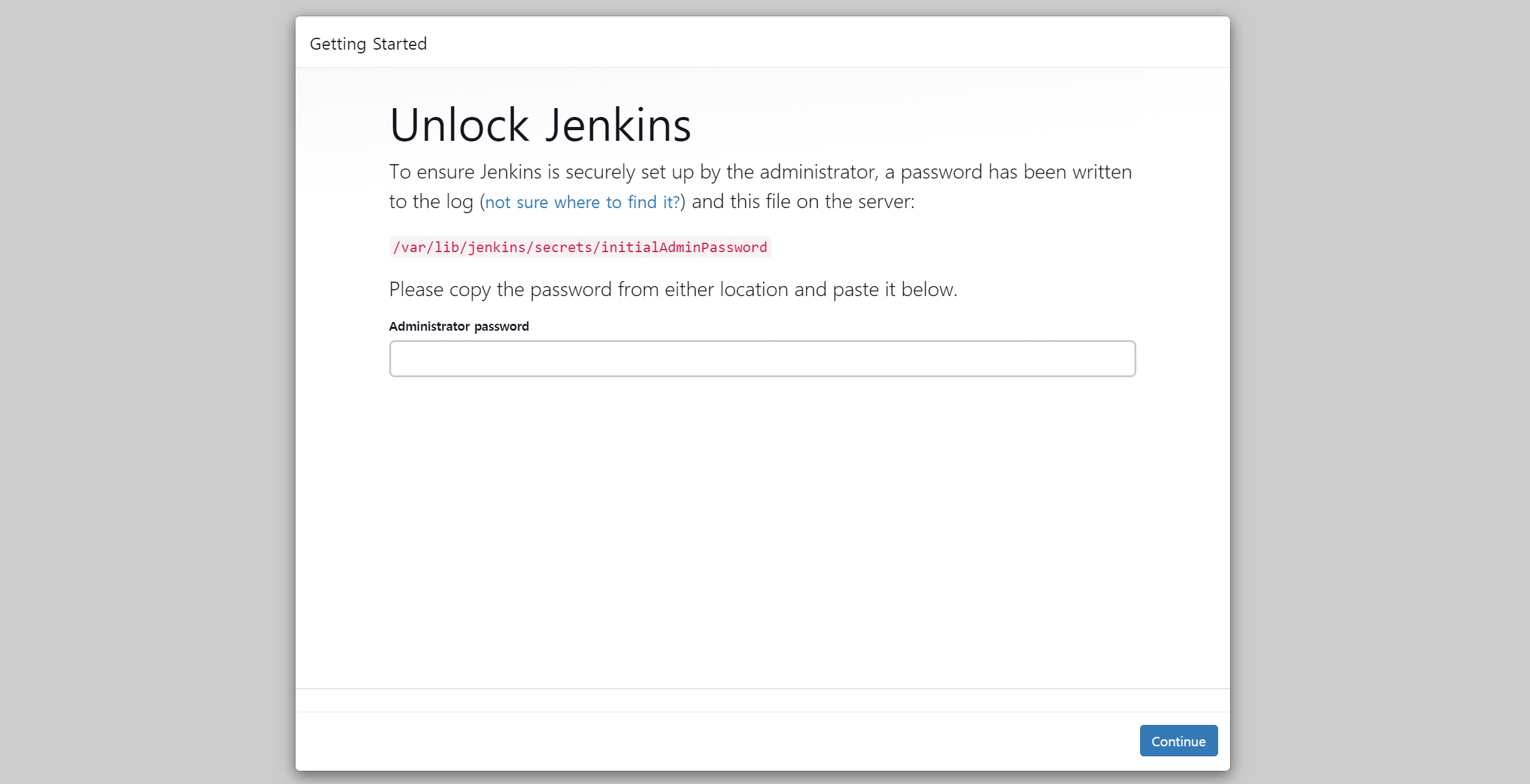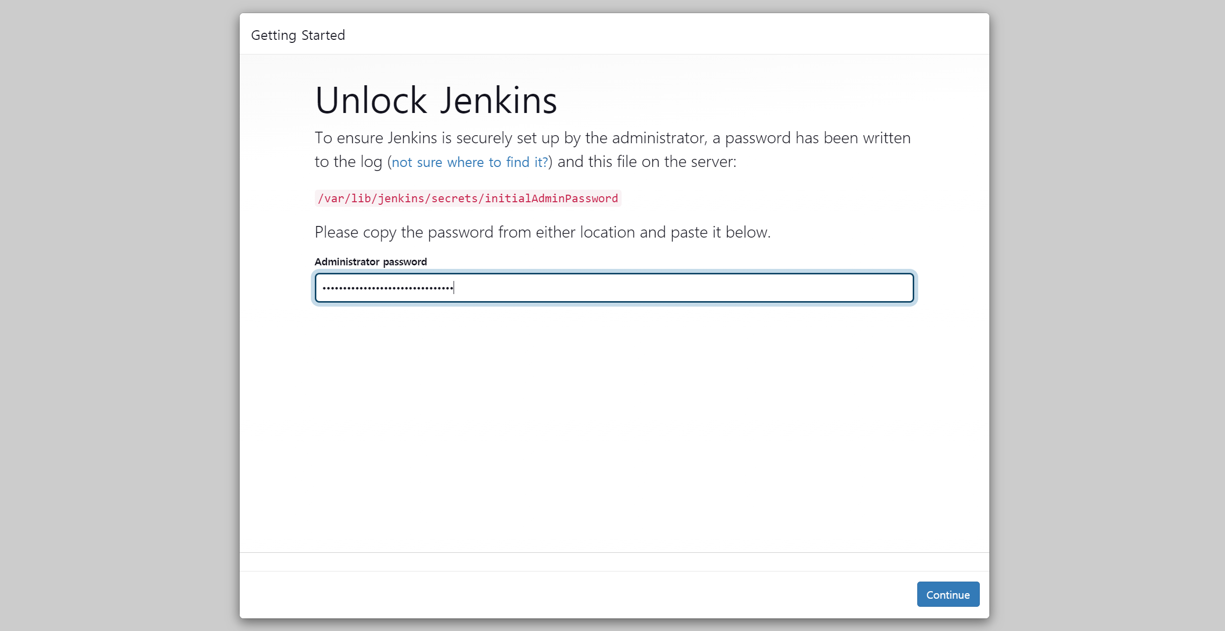 초기 관리자 비밀번호 파일 내용을 복사하여 붙여넣기 한 후 [Continue] 버튼을 누른다.