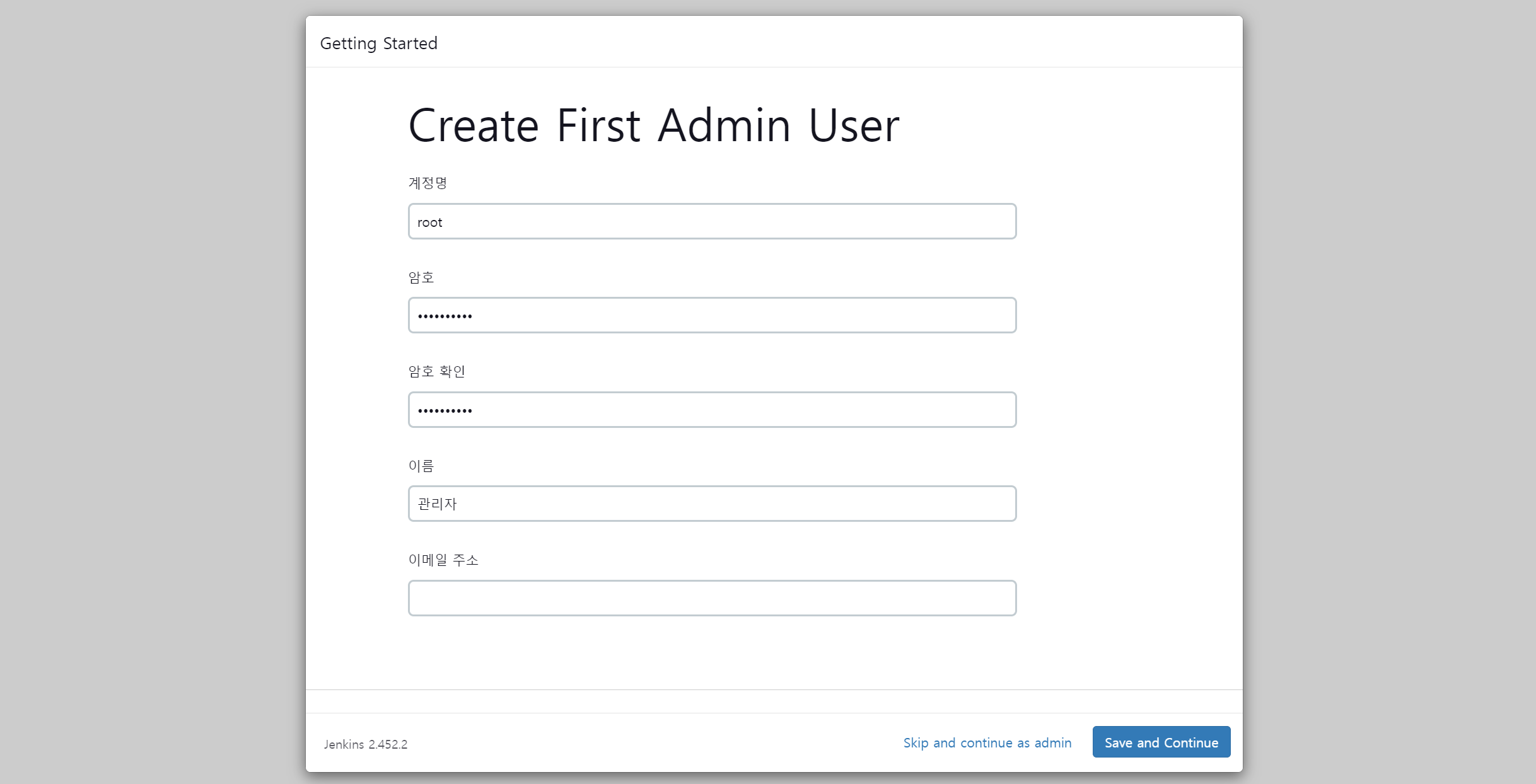플러그인 설치가 완료되면, 관리자 계정 생성 페이지가 출력된다.